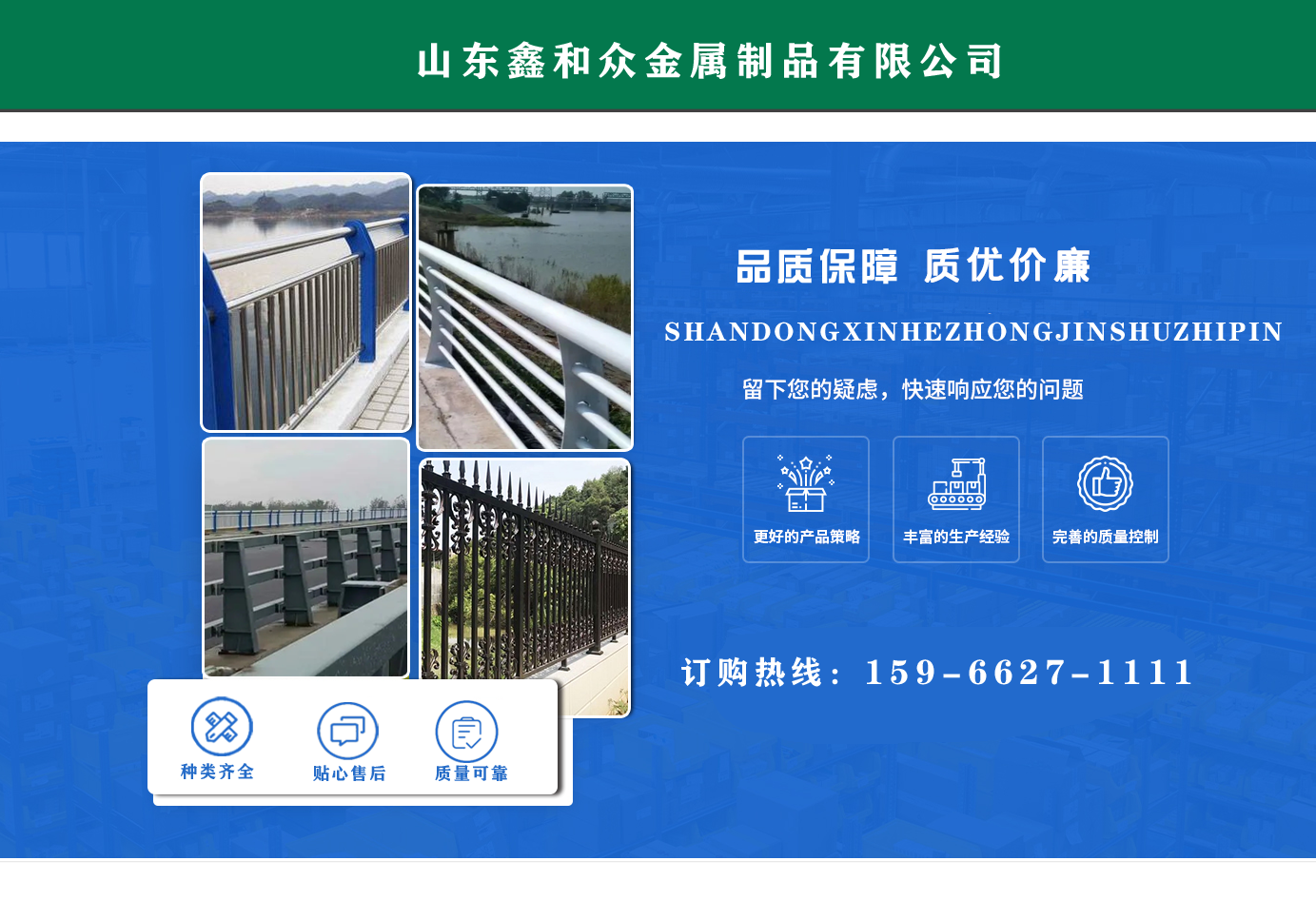 山東鑫和眾金屬制品有限公司主要產(chǎn)品有防撞護(hù)欄,橋梁護(hù)欄,道路護(hù)欄,河道護(hù)欄,不銹鋼護(hù)欄等護(hù)欄。提供設(shè)計(jì)方案,一站式定制,包您滿意價(jià)格優(yōu)惠,歡迎來電咨詢! 公司常年從事銷售護(hù)欄防撞護(hù)欄,橋梁護(hù)欄,道路護(hù)欄,河道護(hù)欄,不銹鋼護(hù)欄,橋梁鋼護(hù)欄,河道燈光護(hù)欄等。產(chǎn)品廣泛應(yīng)用于橋梁、河道、旅游景區(qū)、道路、公路、公園、小區(qū)、景觀、道路防撞等領(lǐng)域?! 」井a(chǎn)品均采用優(yōu)質(zhì)不銹鋼材料,符合相關(guān)標(biāo)準(zhǔn)。各種型號不銹鋼復(fù)合管及護(hù)欄,質(zhì)量嚴(yán)格把控。產(chǎn)品強(qiáng)度高、耐腐蝕、焊接牢固、抗沖擊、性能好,防撞護(hù)欄結(jié)構(gòu)簡單、美觀實(shí)用大方。 歡迎前來訂購!...